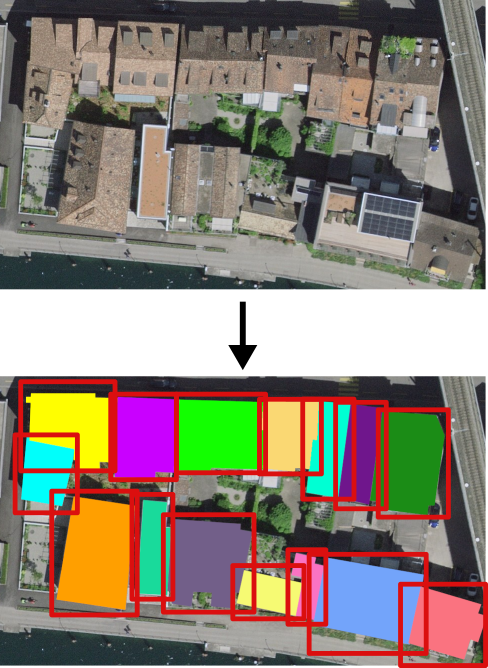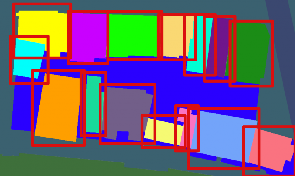 Fourth, Instance Segmentation extends Instance Detection by applying Image Segmentation to each instance. Therefore, in addition to generating bounding boxes, a segmentation map is produced for each bounding box. Instance Segmentation is particularly valuable in scenarios where multiple instances touch or overlap, as Image Segmentation might merge separate instances into a single entity. An example illustrating the usefulness of Instance Segmentation is shown in Figure 4, where adjacent buildings are extracted as distinct instances. Typically, one of the models of the RCNN family is used for this task.