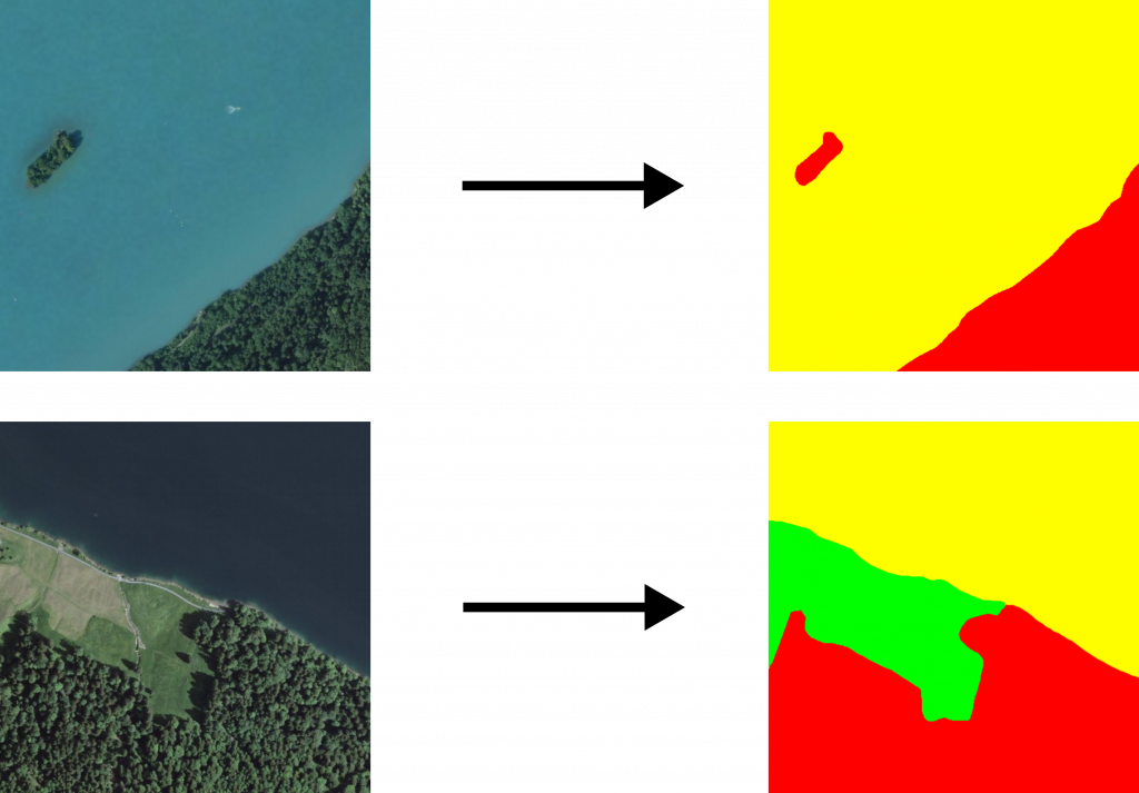 Second, Image Segmentation represents an extension of the Image Classification problem. While the input is still an image, the task is not to output a single category but rather another image in which each pixel holds a value representing the class at that location. This means that the output typically consists of multiple classes, including one or more for the objects to be segmented and another one for the background. In practice, neural networks can handle virtually any number of classes. Figure 2 provides examples of how satellite images can be segmented according to the depicted land cover types. Typical neural network architectures for this task are U-Net, SegNet and PSPNet.