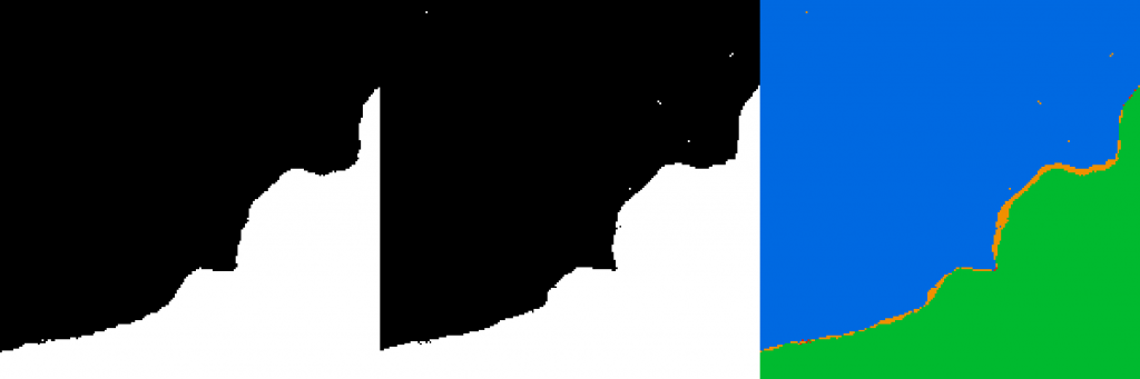 These are being calculated in lines 14-17. We then create a new array, which can be used to hold these errors (line 21). Each cell of this array will be assigned a number from 0 to 3, depending on which case applies to the respective pixel (lines 23-26). Finally, we write this error image to disk (lines 30-36). An example of how the error mask can be visualized alongside the predicted and the groundtruth data can be found in Figure 1.